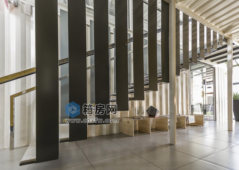 一層是會客室、會議室和公共休閑空間:硅鈣板覆蓋了大部分的墻面,掩蓋了集裝箱自帶的波浪板;中間是鋼架構(gòu)連通的玻璃幕墻,中空部分種上了植物,環(huán)境優(yōu)美,光線充足;帶有半戶外走廊,空間充足。