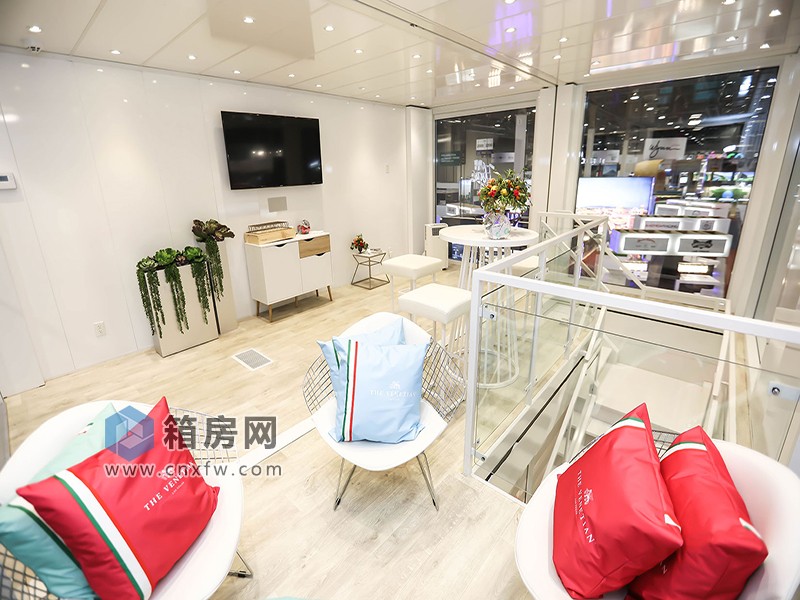 整個集裝箱展廳由4個集裝箱單元組合而成,展廳內部配有標志性的酒店裝飾,內部設有調酒的長型吧臺和休息的桌椅,客人可以品嘗到威尼斯人的招牌雞尾酒。此外,展廳的頂部是一個帶頂棚的露臺,同樣設有充足的座位,讓客人在高層流連忘返,盡情享受酒店的美酒,而寬敞開放的主樓層則方便客人流通。