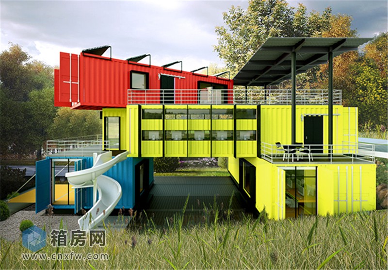 由8.5個(gè)海運(yùn)集裝箱改裝而成的五彩繽紛辦公室,不規(guī)則的層次錯(cuò)落,自然優(yōu)美的綠化環(huán)境,極具設(shè)計(jì)美感。辦公室被環(huán)境中豐富植被所包圍,在施工過程中必須保護(hù)原有的植被,所以集裝箱模塊式預(yù)制建筑是首選,最大限度地提高建造和使用效率。