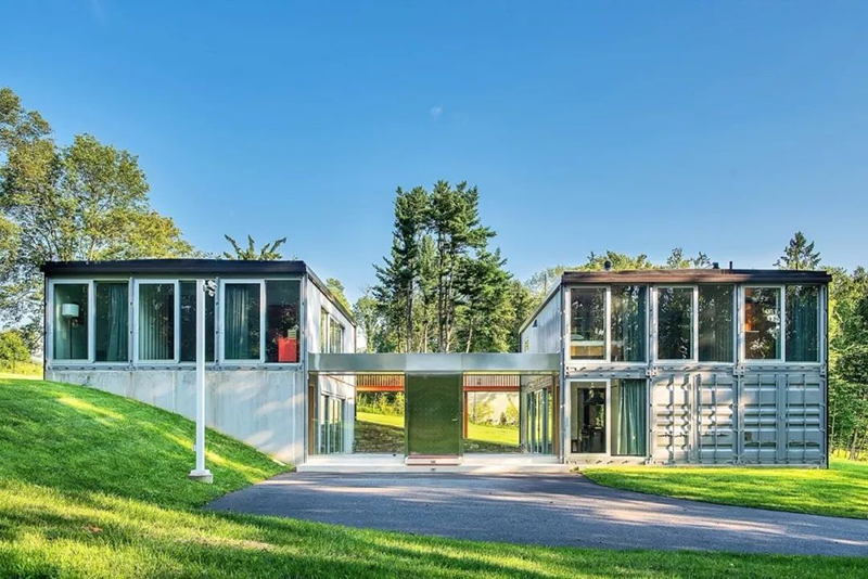 這座4000平方英尺的住宅由9個40英尺長的集裝箱組成,集裝箱分成兩個翼,由一個巨大的青石庭院連接,二樓還有一座外部鋼木橋梁。入口處有一扇巨大的鋼制樞軸門。[查看詳情]