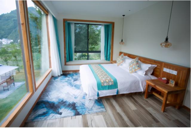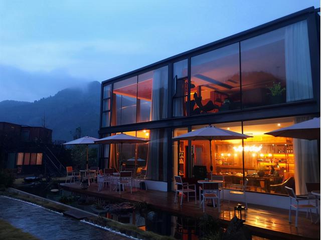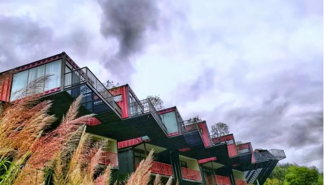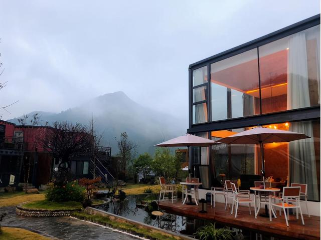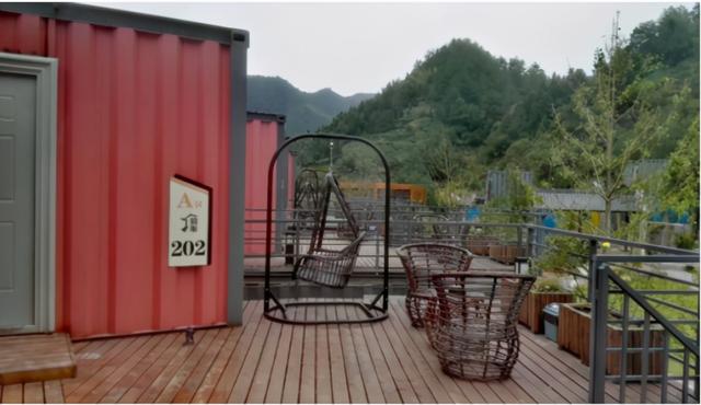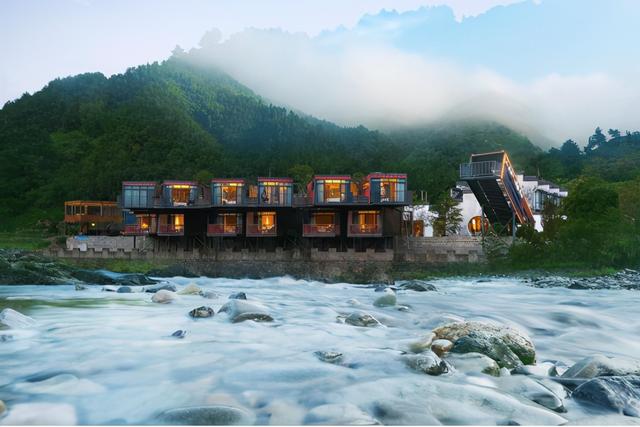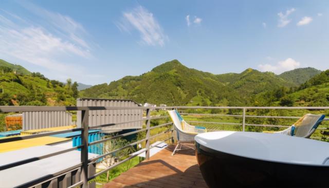 獨(dú)特集裝箱建筑坐落于美妙的山水之間,房間露天陽臺(tái)正對(duì)著外面的大山和流水,晚上能聽到靜靜地流水聲,落地大窗戶,躺在床上就能看到遠(yuǎn)處的風(fēng)景。