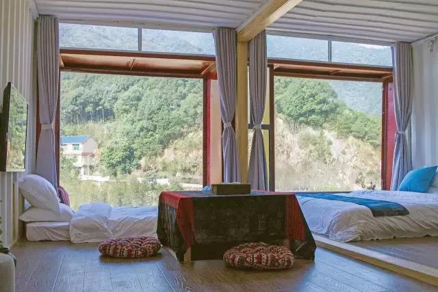 房間有兩個(gè)超大的落地窗,山景一覽無(wú)遺,沉浸在大自然的山景里,一個(gè)人慢慢靜心下來(lái)。