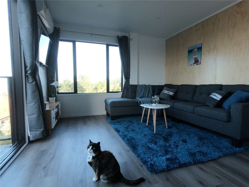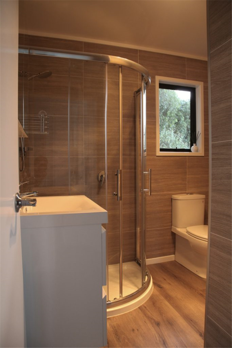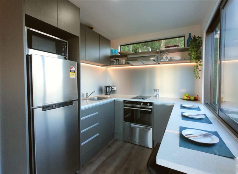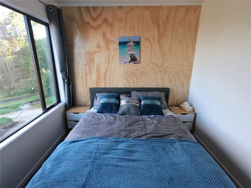 主臥室和起居區(qū)的寬度為1.5個容器,比單寬度模型具有更多的空間。除了主臥室,房屋內(nèi)還有一個空置的次臥。為了增加防潮效果,衛(wèi)浴間的墻面和地板都貼上了瓷磚,整體空間比較小巧。