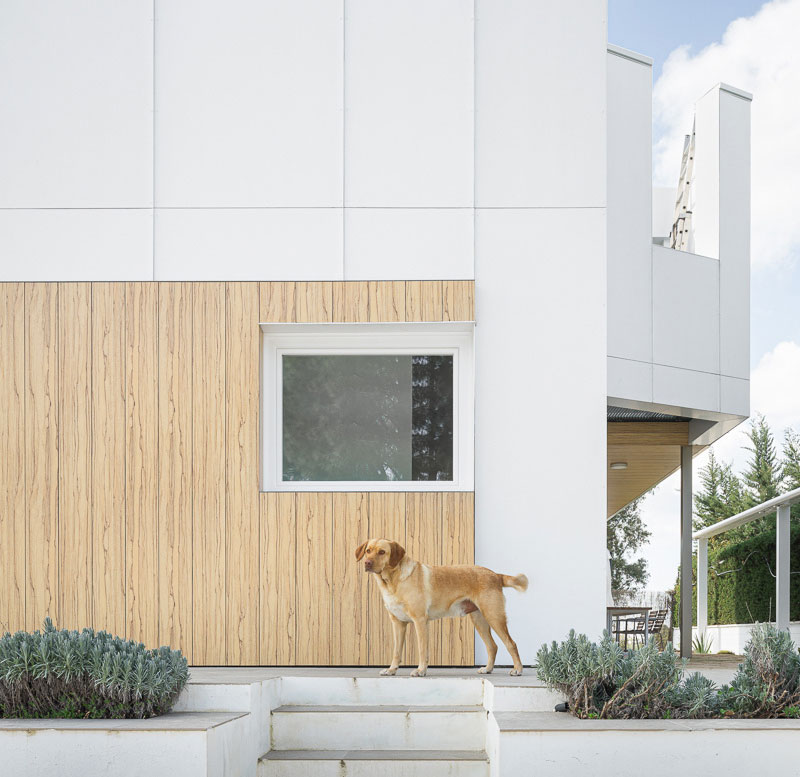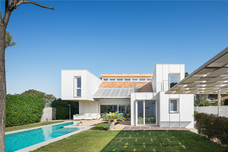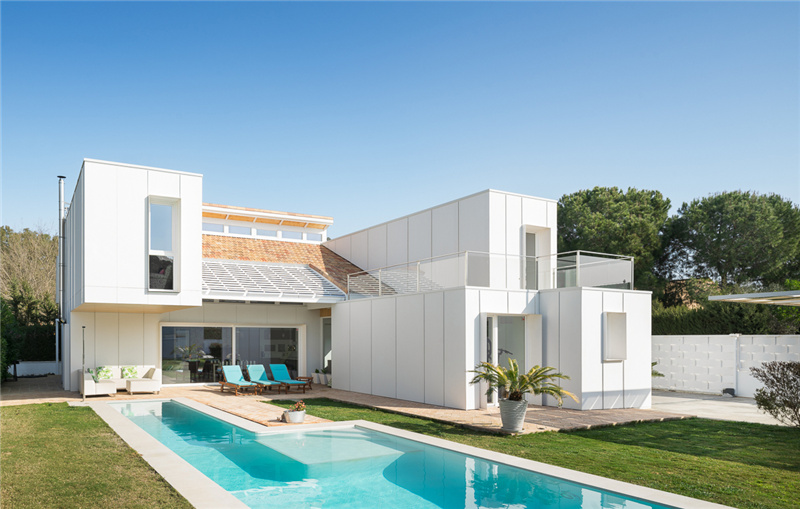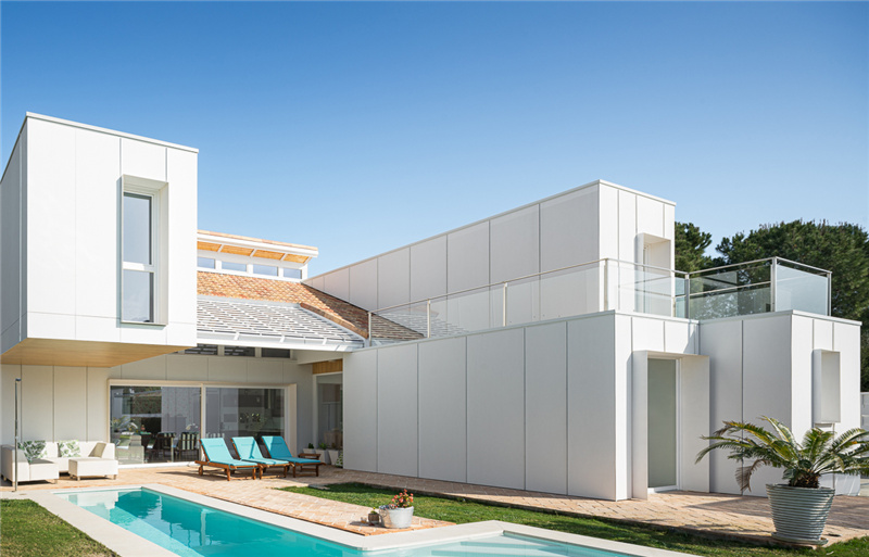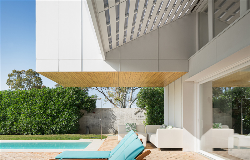 延伸到游泳池上方的容器創(chuàng)建了一個舒適的門廊,利用遮陽板將其與北面的建筑物相連起來,可以將客廳放置中部的空間里。第一眼看到該集裝箱房屋的白色涂料外觀,就會有一種平和的感覺。與傳統(tǒng)的容器式建筑相比,這種一以貫之的設(shè)計讓房子看起來更現(xiàn)代。