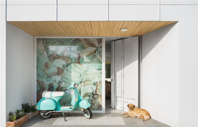 集裝箱的整個金屬板被切割,兩個翻轉(zhuǎn)形成了一個夾層,另一個五米的集裝箱延伸到房屋前方,并利用固定門的設(shè)計支撐整個夾層。作為第一視角,第一個兩層的體量幾乎覆蓋了整個建筑的表面,在穿過房門后起到了屏障的作用,同時也實現(xiàn)了更連通的活動空間。