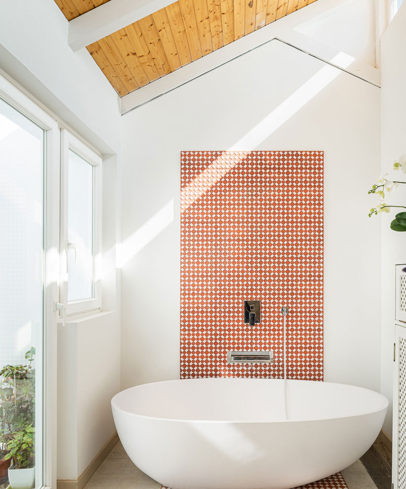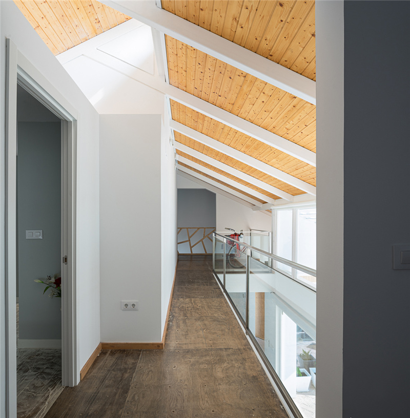 屋內(nèi)采用復(fù)式結(jié)構(gòu),使空間看起來更為寬敞。房屋的屋頂以木板覆蓋,實現(xiàn)室內(nèi)保溫的作用。其中,恰到好處的落差創(chuàng)造了一個透光的天窗,為該樓層的臥室和衛(wèi)浴間打造了明亮且舒適的居住環(huán)境。