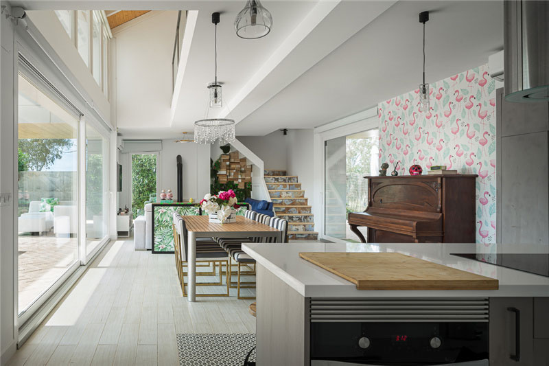 屋外優(yōu)美的景色通過大面積的落地玻璃窗透進屋內(nèi),即使身處室內(nèi)也能為寧靜的美景著迷。房屋內(nèi)部布置了簡單的細節(jié),開放式的廚房和就餐區(qū)為生活預(yù)留了更多的活動空間,把全景玻璃門推開便可以連通戶外的泳池。