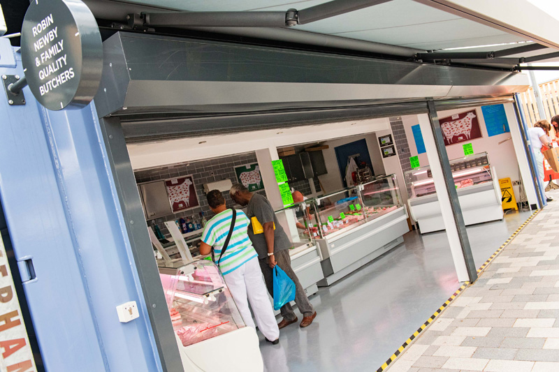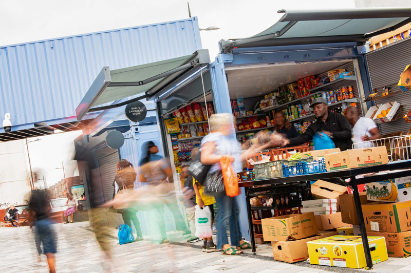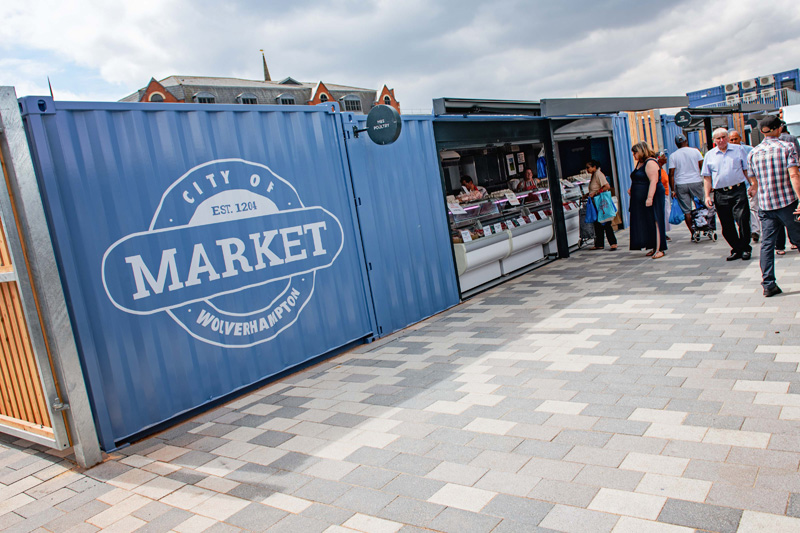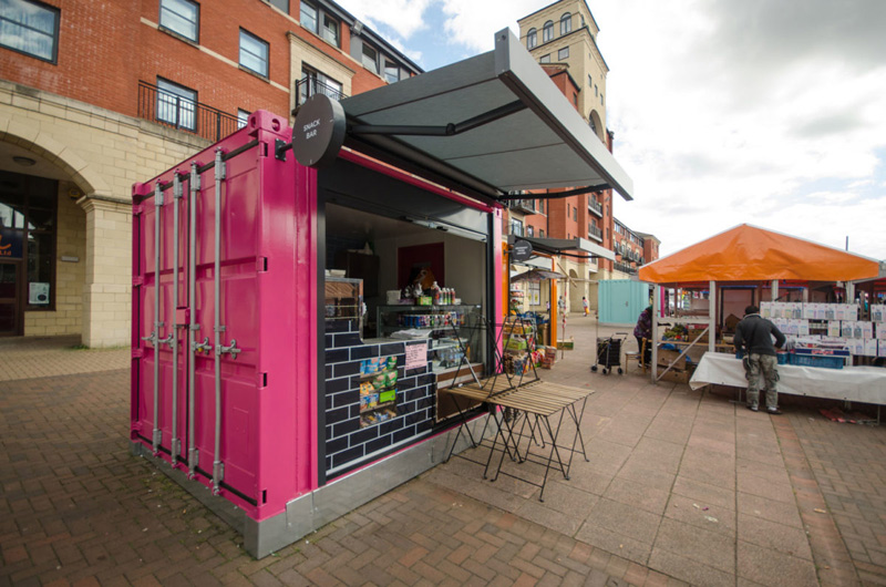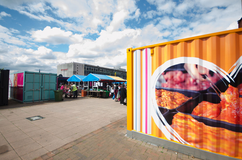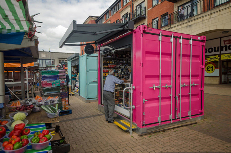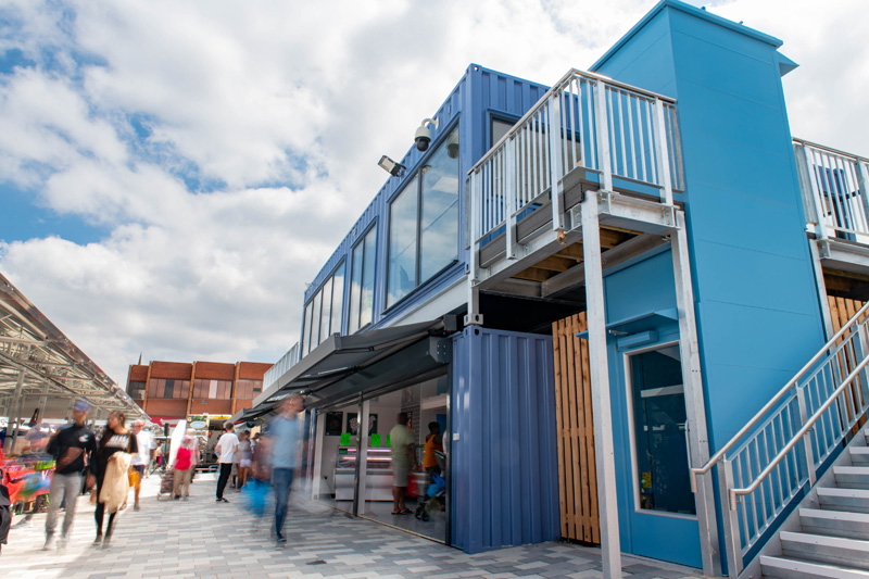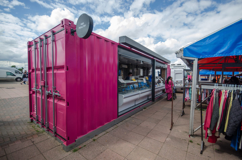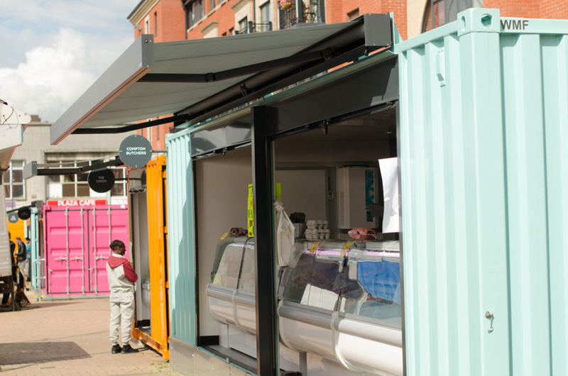 這是位于英國的伍爾弗漢普頓市場,經(jīng)過重新開發(fā)和搬遷成為了城市中心歷史建筑重建的重要部分。為了能讓市場快速地重新運轉(zhuǎn)起來,集裝箱便是本次重建的主角。同時,集裝箱的模塊結(jié)構(gòu)能將每間商店獨立分隔,各自管轄自己的店內(nèi)衛(wèi)生環(huán)境,保證了市場整體的整潔。