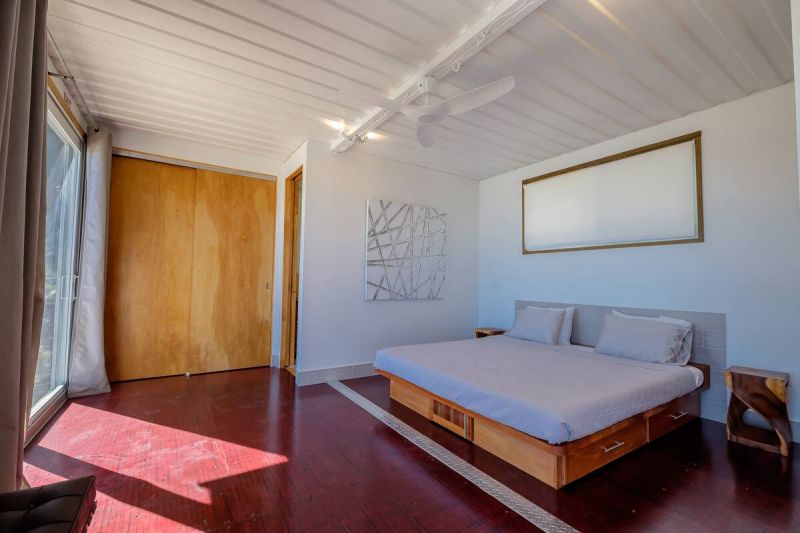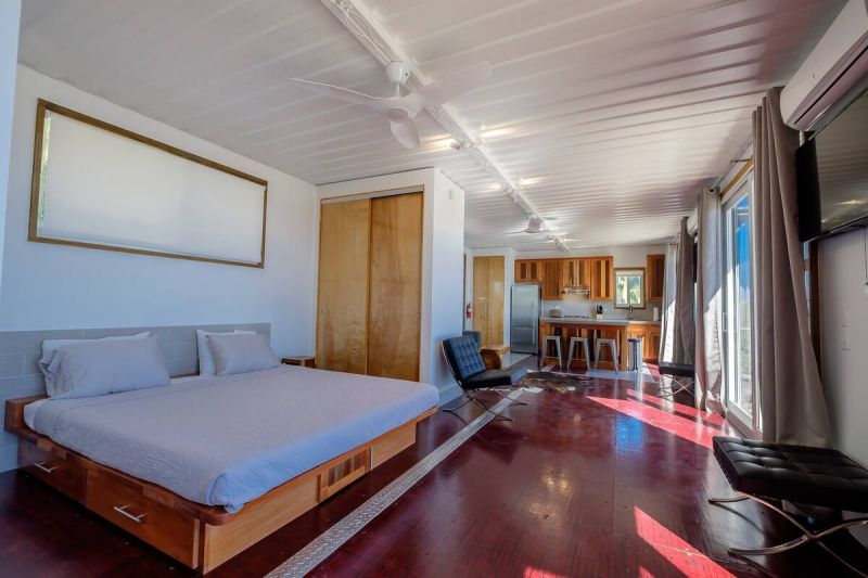 一個衣柜相隔的背面是臥室空間,一室公寓式的臥室配有一張?zhí)卮筇柕拇玻梢钥吹椒课莸牡匕迨潜A袅算T釘和其他一些原始的集裝箱材料。私人浴室位于臥室的旁邊,配有混凝土洗手臺和一個寬敞的瓷磚站立式淋浴間。