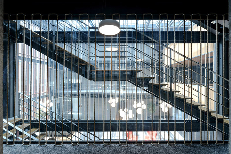 你會發(fā)現(xiàn),辦公樓的內部充斥著各種密密麻麻的線條,不僅是吊燈,還有樓梯的屏風……這是設計的特色之一,突出了空間幾何的邊緣,讓整體有自上而下的垂直傾注感。同時,還會讓環(huán)境減少了毫無遮擋之下直勾勾的視覺沖擊。