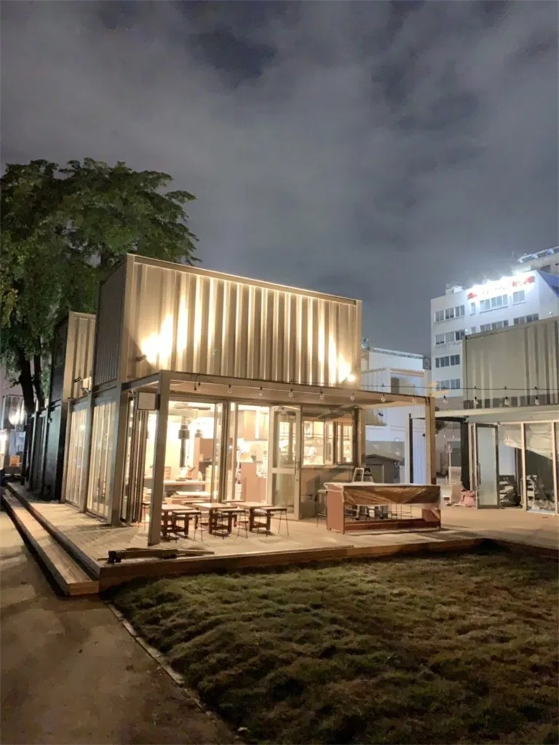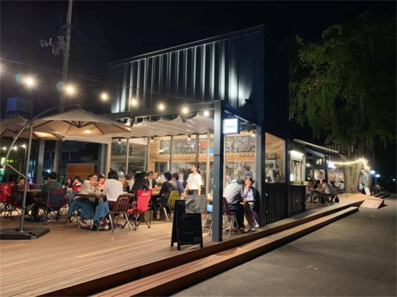 其實(shí)這些集裝箱建筑都有著統(tǒng)一而時(shí)尚的風(fēng)格,但同時(shí)又有著各具特色的店面設(shè)計(jì),讓你可以區(qū)分不同的店家??v觀建筑物,有的店家將其店面進(jìn)行混凝土澆筑,有的則替換了許多落地玻璃窗打造浪漫玻璃屋,還有的拉上了星星燈來點(diǎn)綴夜景……