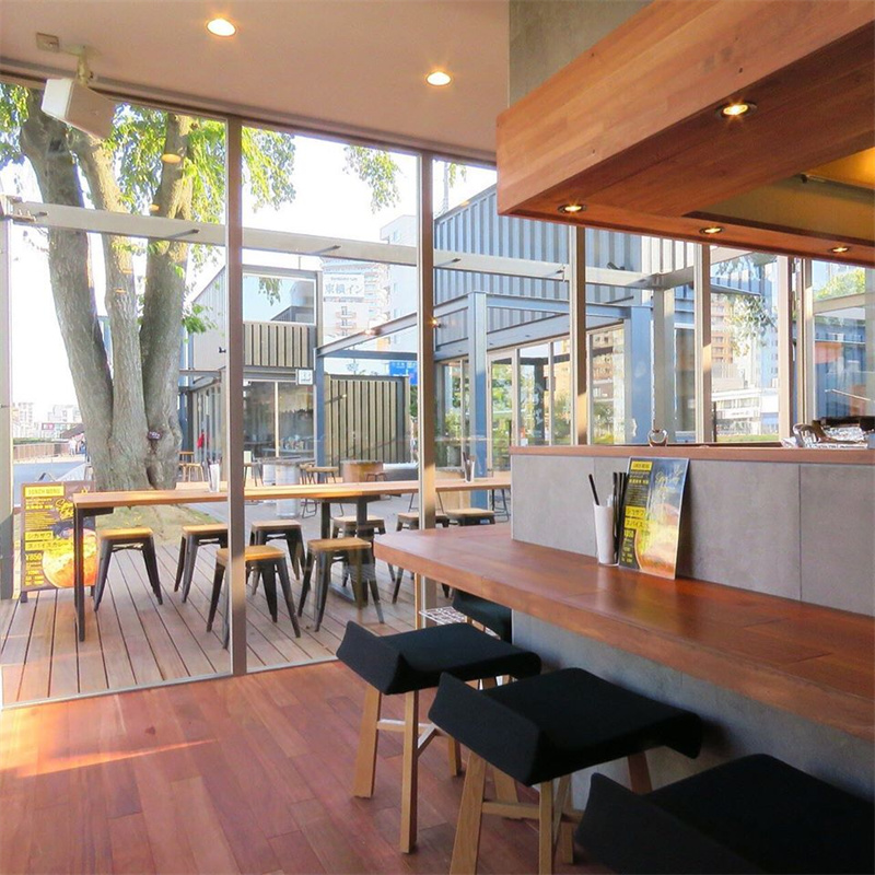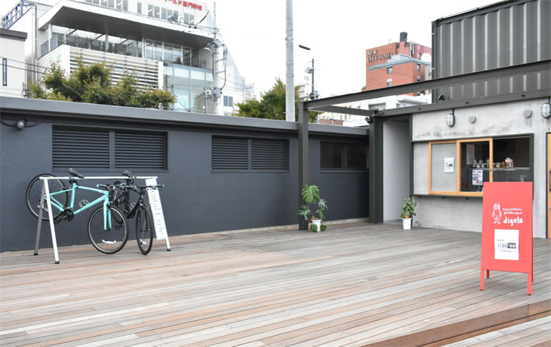 繼續(xù)往前走,你會(huì)得到一個(gè)木甲板鋪設(shè)的小露臺(tái),這里正好是一顆在此生長的大樹,集裝箱建筑在此繞開的位置造就了這個(gè)可用于戶外休閑就餐的小廣場,還能蹭到乘涼的樹蔭。