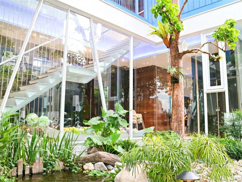 負(fù)責(zé)設(shè)計(jì)該餐廳的設(shè)計(jì)師表示,該土地寬6公尺、長(zhǎng)約37公尺,面積不大且呈現(xiàn)狹長(zhǎng)型,周?chē)詾樾麓髽?,有許多花園景觀。因此該餐廳采用了大量玻璃,引光納景,增強(qiáng)穿透性。