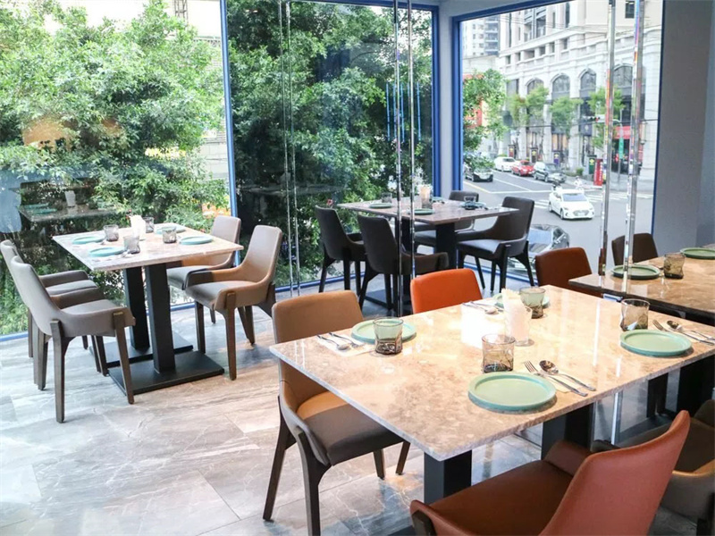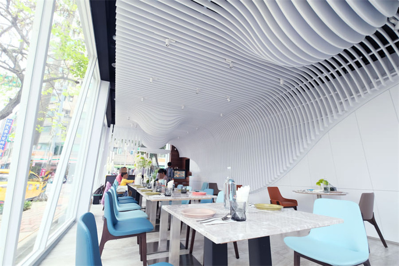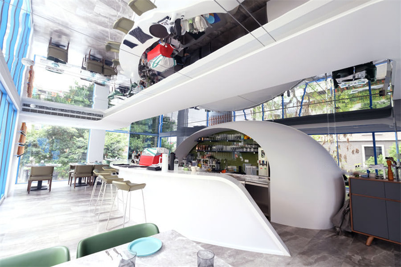一樓主要為落地玻璃的透光設(shè)計(jì),靠墻一邊的天花是片狀材料拼成的水滴型裝飾,極具現(xiàn)代感和藝術(shù)線條美,讓環(huán)境瞬間變得高大上起來(lái),引起視覺(jué)上的愉悅,有利于顧客用餐心情。