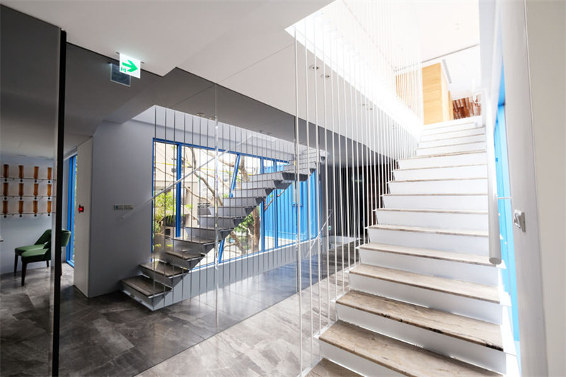 三層樓的設(shè)計(jì)皆不相同,一樓以密集板加上2D激光,打造出海浪輕涌的造型。門(mén)前利用與人行道相接的一小塊空地規(guī)劃生態(tài)池、種植茄苳。路人經(jīng)常被外觀所吸引。