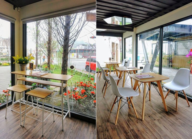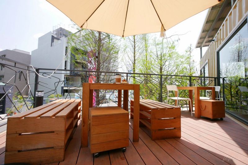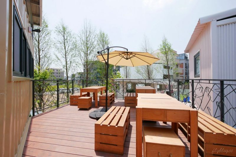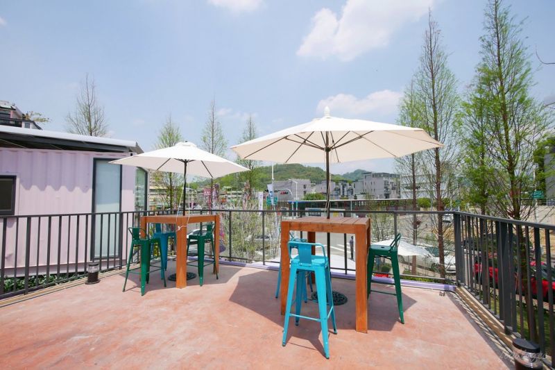 餐廳一共有兩層,二樓的用餐區(qū)包括了室內(nèi)和室外。室內(nèi)用餐區(qū)設(shè)置在單個(gè)集裝箱單元內(nèi),空間形狀呈長條形。室外的用餐區(qū)設(shè)置在戶外的多張木制沙發(fā)上,并安裝遮陽傘來提供舒適的就餐環(huán)境。