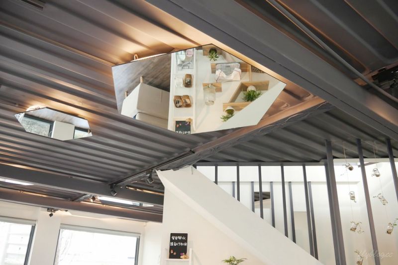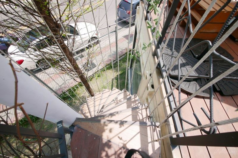 在二層的露臺(tái)參觀完之后,你可以選擇在建筑旁的鋼制旋轉(zhuǎn)樓梯下達(dá)一層,旁邊的樹可以遮蔽一部分陽光,不用擔(dān)心會(huì)很曬。