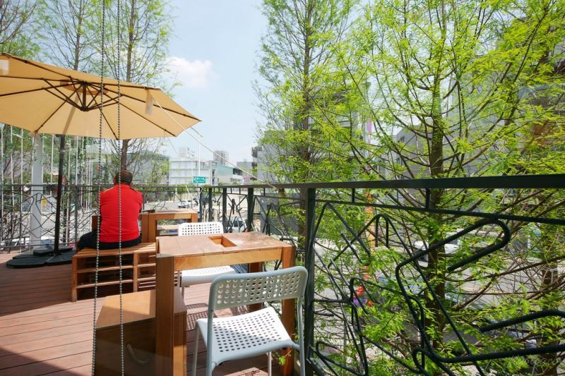 從二層的一條鋼制天橋可以通往另一個(gè)室外用餐區(qū),在這里可以俯瞰到周邊的景色,配上藍(lán)天白云營造出悠閑的感覺。