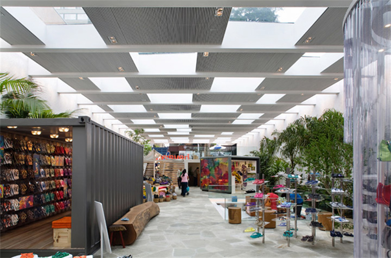 大型店面內,設計了不同風格的商品展示區(qū),其中也運用到了海運集裝箱元素。店中有店的空間設計,跟隨陽光的明暗變化,更大地增強了室內海灘的真實感。