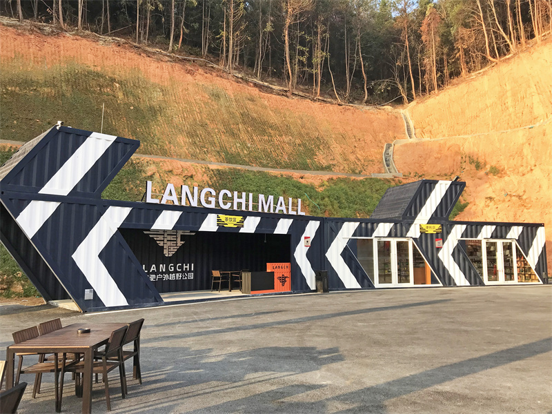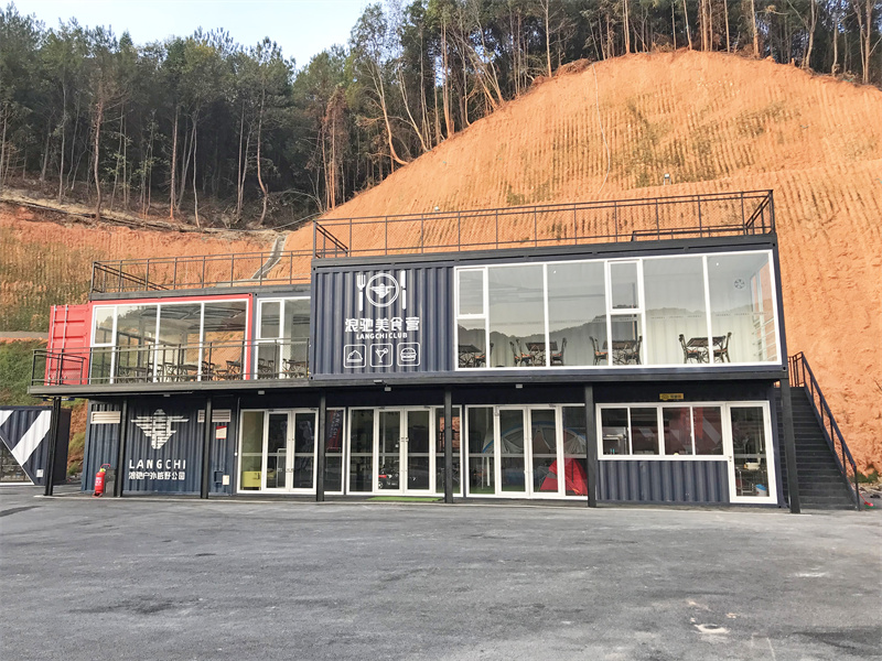 靠進山腳的一邊還有一座以黑色為主打色的休息區(qū),同樣是由集裝箱改造而成的二層建筑。這座建筑的特色在于由其原始箱門打開而形成的露臺,在底層面積比上層少的情況下,二層用了鋼架構(gòu)來加固。