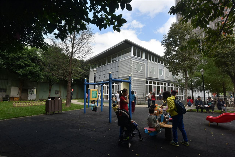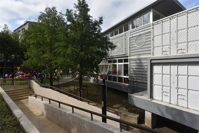 這座灰色集裝箱堆疊的活動中心,宛如大型貓頭鷹樂高積木,屋頂?shù)呢堫^鷹耳羽相當(dāng)醒目,與公園及兒童游樂場地景融為一體。該建筑采用最新穎的輕鋼構(gòu)工法,透過各式綠色建筑元素,不但環(huán)保耐震,也達(dá)到節(jié)能、減廢、健康的目標(biāo)。