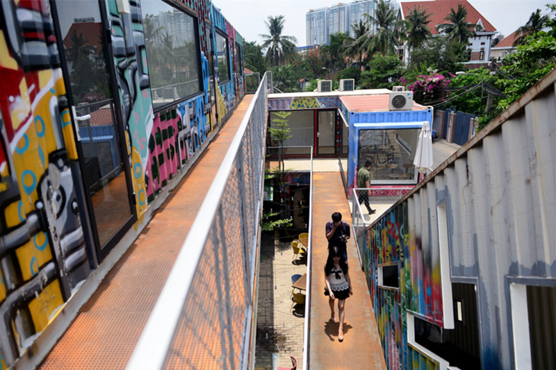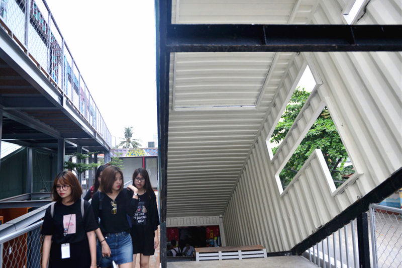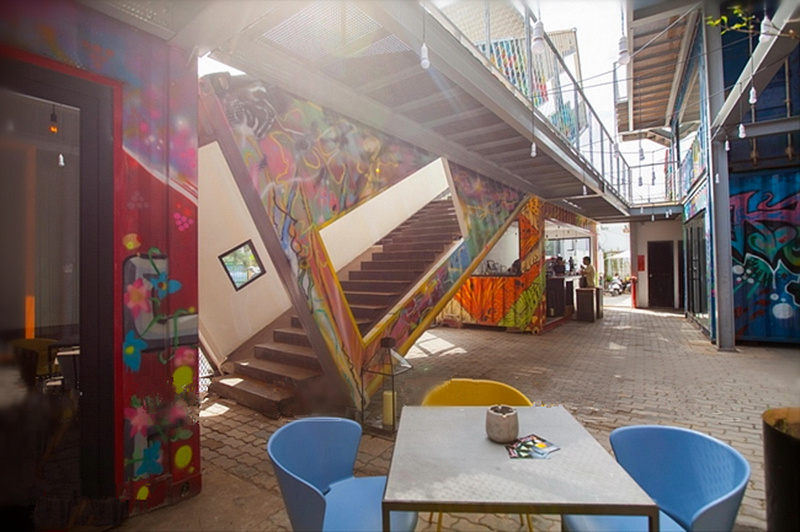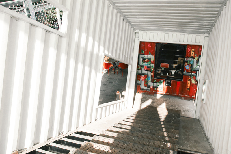 個性的涂鴉展現(xiàn)年輕活力,傾斜擺放的貨柜樓梯是一大亮點(diǎn),成了最近當(dāng)?shù)厍嗄昱恼沾蚩ㄖ亍?