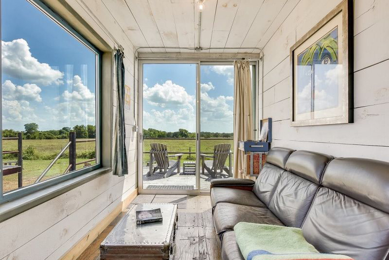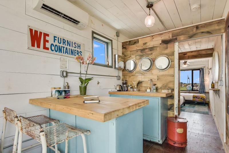 進(jìn)入集裝箱模塊內(nèi)部,這是一座帶起居室,沙發(fā),椅子,茶幾,天花板照明和深色硬木地板的現(xiàn)代住宅,極具復(fù)古韻味。這里沒(méi)有電視,但有一堆獨(dú)特的書(shū)籍,可以在閑暇時(shí)汲取精神糧食。廚房帶有微波爐,吊燈,冰箱,實(shí)木柜臺(tái)和落水槽,可以滿(mǎn)足基礎(chǔ)的烹飪需求。