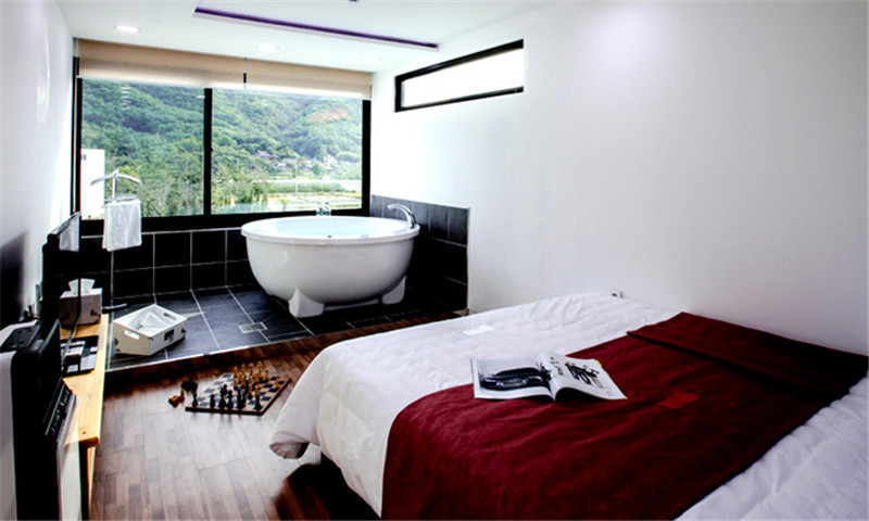 順著樓梯而上,二層為臥室以及泡澡區(qū)域,一邊洗著泡泡浴聽著歌兒,一邊欣賞著窗外青山綠地美景。這樣的享受會不會太美好?