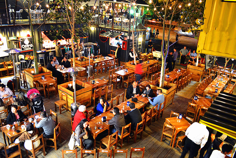 這是一個由集裝箱組建而成的休閑飲食聚集地,主打黑黃色調(diào),黑色經(jīng)典搭配上明亮的黃色,簡單而不失時尚。一個開放式的休閑飲食中心,造型不一的集裝箱建筑相連接圍成一個兩層的矩形方陣,集裝箱體作為餐廳廚房,中部露天廣場和二層集裝箱頂部作為堂食區(qū)供客人使用。