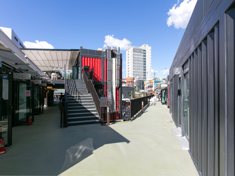 商場整體采用黑色+紅色點綴的外殼,顯得更為低調(diào)奢華一些??偣灿腥龑訕牵酵霞b箱數(shù)量越少,形成了一座類似金字塔的形狀。商場的中間有一個露天的平臺,以木地板鋪設(shè),提供了一個可以休閑聚會、舉辦活動的地方。