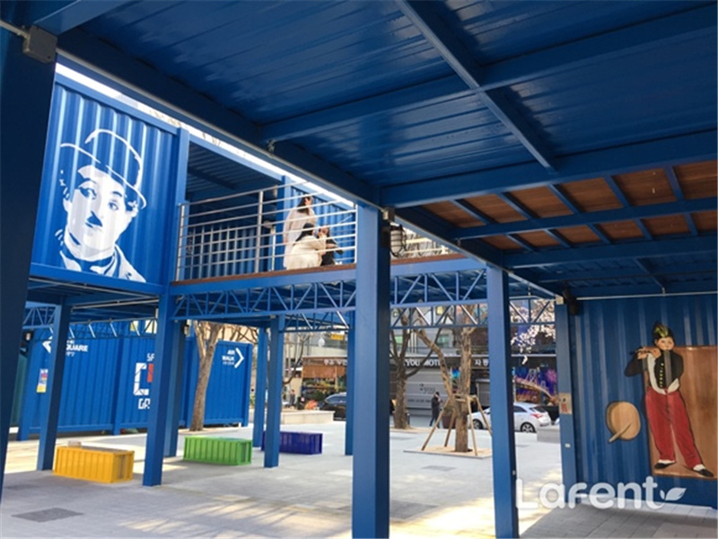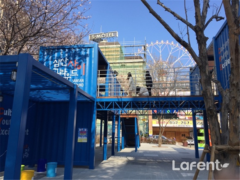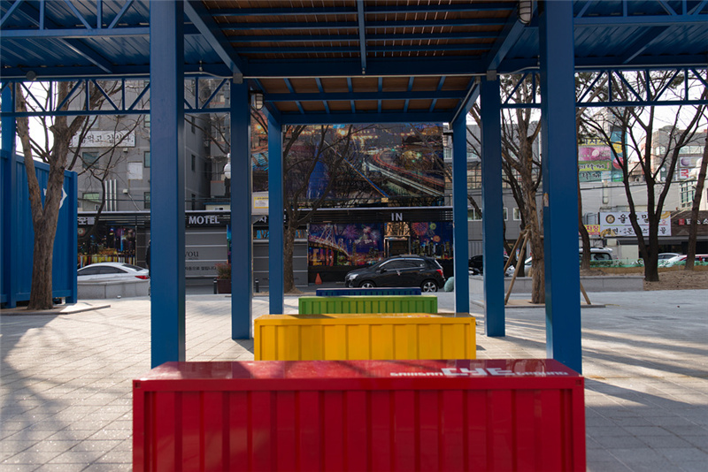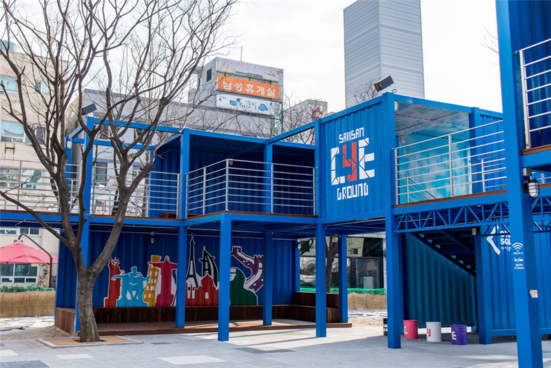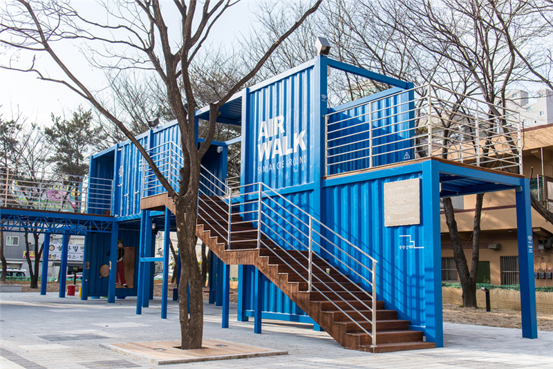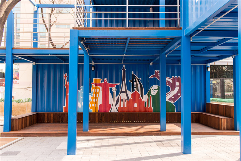 街頭獻藝文化通常都是年輕人群體,為了追趕上潮流,這個【CYE】街頭文化基地,選用了鋼架構搭建成集裝箱外形。濃濃的現(xiàn)代工業(yè)感,鏤空的鋼架構設計更是讓人倍感新穎。涂層的藍色也是和韓國建國大學用200個集裝箱搭建的 common ground 相似,醒目而又清新的藍。