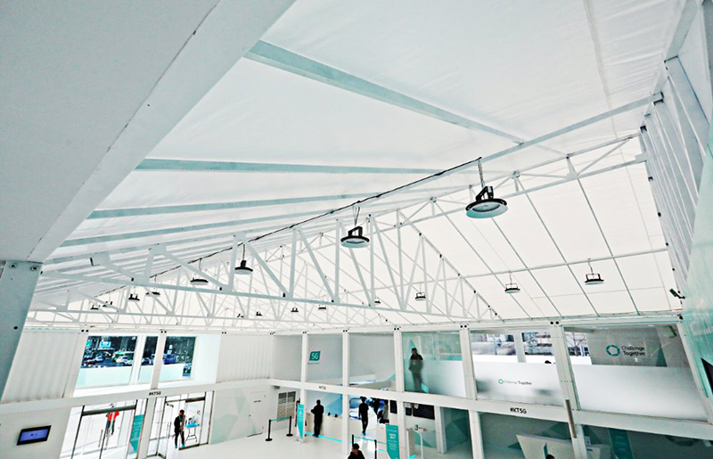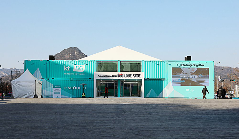 主體采用一塵不染的淺藍(lán)作為直播站的外觀,象征著韓國的藍(lán)天。由多個集裝箱拼接而成的大型建筑,箱身上有kt公司的標(biāo)志和宣傳語,在規(guī)范尋常的建筑群中成功脫穎而出。