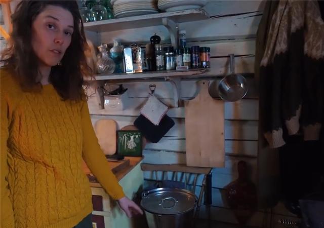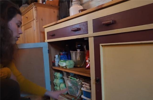 再往里走去,是夫妻倆的小廚房,同樣沒有任何電器設備,一張小案板、幾個存放食物的瓶瓶罐罐,就是廚房的全部家伙什兒~有些中世紀農(nóng)場生活的感覺。做飯要到一旁的爐子上生火去做,后面我們會看到。