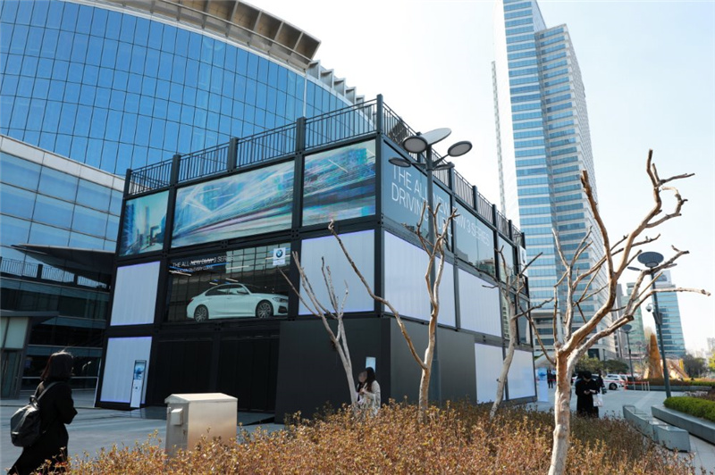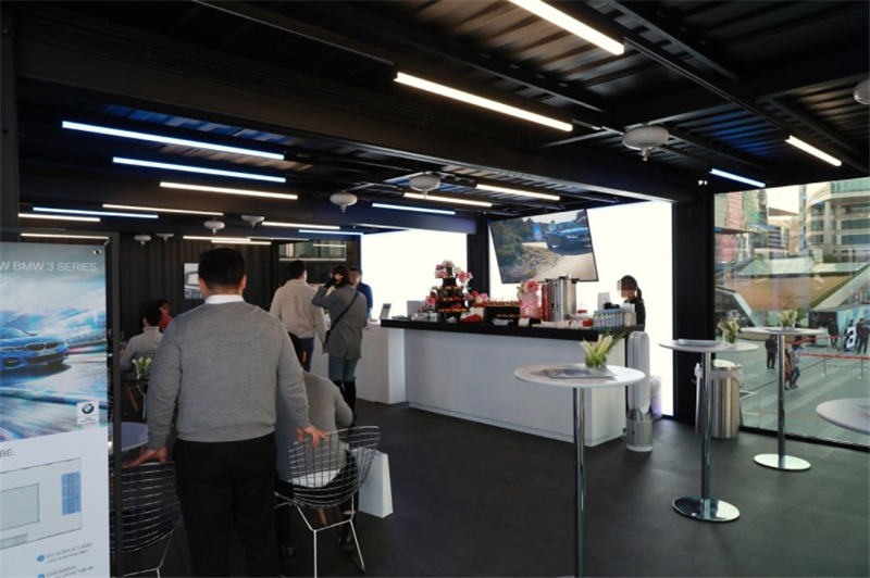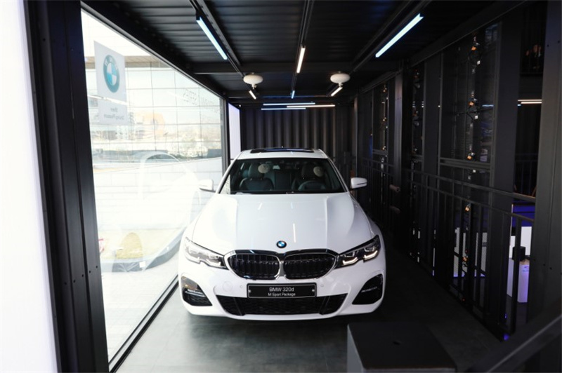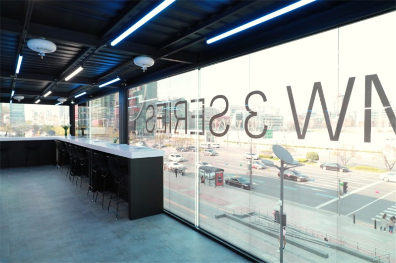 這個(gè)寶馬展廳由多個(gè)集裝箱和鋼架構(gòu)組合構(gòu)建而成,但是波浪板箱壁卻被落地玻璃所替換,營造了一種高級(jí)商務(wù)感;同時(shí),這樣的設(shè)計(jì)也會(huì)為室內(nèi)的透光帶來便利,讓環(huán)境更為明亮一些。