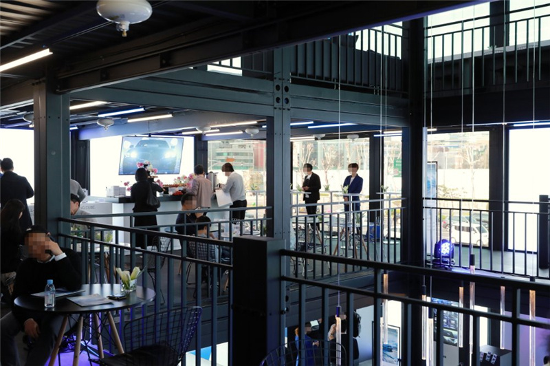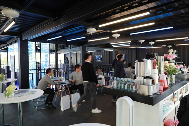 得益于玻璃窗的設(shè)計(jì),一些桌椅沿窗而設(shè)來客既能看車也能享受優(yōu)美的周邊景色。但室內(nèi)的一些墻壁仍然是“銅墻鐵壁”卻為各種發(fā)光宣傳欄提供了懸掛的位置,用以展示品牌車型的特色。